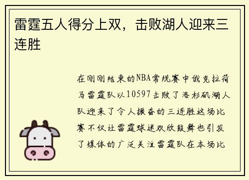 在刚刚结束的NBA常规赛中,俄克拉荷马雷霆队以105-97击败了洛杉矶湖人队,迎来了令人振奋的三连胜。这场比赛不仅让雷霆球迷欢欣鼓舞,也引发了媒体的广泛关注。雷霆队在本场比赛中展现出了强大的团队实力和出色的球员个人表现,尤其是五位球员得分上双,成为比赛胜利的关键因素。